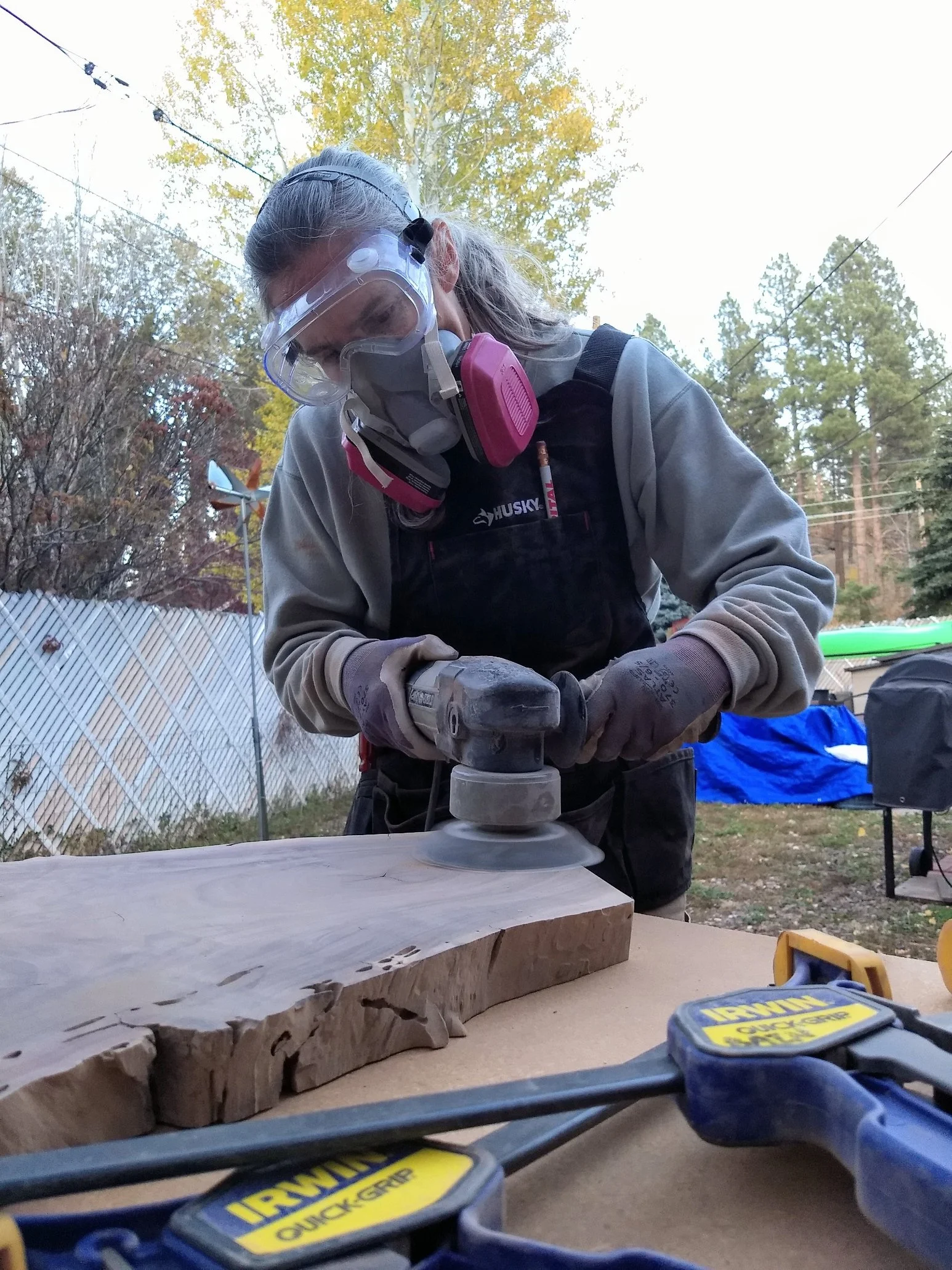 I work in my backyard at home, in my favorite office. However, I do take my work into the garage while finishing or when the weather turns too cold. In the background of the photo to the right you can see where I have some wood hiding from the elements under the blue tarp for future projects.